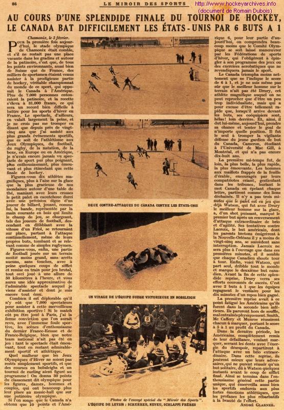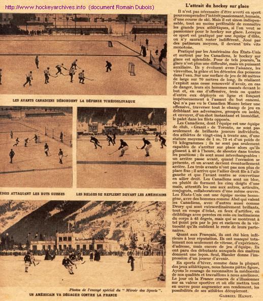 Le premier article, un compte-rendu de la finale Canada - États-Unis, est carrément dithyrambique sur le hockey sur glace. Vétéran du journalisme sportif, l'auteur André Glarner explique qu'il n'avait "encore jamais vu spectacle de sport pur plus poignant, plus enthousiasmant, plus émouvant et plus étincelant que cette partie de hockey" et tente de décrire ce sport insolite par des comparaisons toutes plus laudatives. Encore une fois, le journaliste a des idées très arrêtées sur le sport, et on observera avec amusement le mépris avec lequel il qualifie le patinage et même le bobsleigh (jugé alors non athlétique !), à qui il nie le statut de sport.