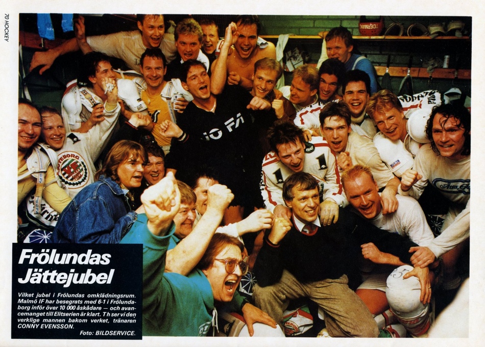 Lorsque Frölunda décroche son retour en élite le 31 mars 1989, Conny Evensson est quasiment sanctifié par les supporters du club. Ceux-ci seront donc terriblement déçus de le voir partir en fin de saison, pour devenir manager de son ancien club Färjestad.