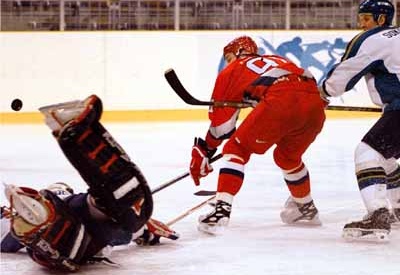 La Russie entre dans la compétition avec une interrogation majeure : dans quel état de forme est Sergei Fedorov, qui n'a pas joué un seul match en compétition cette saison faute d'accord salarial avec les Red Wings de Détroit ? La réponse arrive après seulement une minute et demie. Andrei Kovalenko récupère un palet contré dans sa zone et franchit aussitôt la ligne bleue défensive pour servir à l'autre ligne bleue Fedorov, qui a pris de la vitesse dans le dos de la défense. La feinte du numéro 91 fait se coucher le gardien Vitali Eremeev, et pendant que celui-ci tente le poke-check, il lève alors le palet du revers dans le haut du filet. On s'inquiète pour un Kazakhstan qui semble craintif, reculant face à des joueurs russes dont il se fait une montagne. Mais le capitaine Erlan Sagymbaev, à peine entré en jeu, marque un but totalement inattendu sur un lancer en entrée de zone qui bat Mikhaïl Shtalenkov côté mitaine. Et on en vient alors à une autre question encore plus inquiétante pour la Russie : le niveau de ses gardiens.