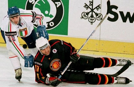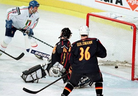 Ce duel oppose des joueurs qui se croisent souvent, et on ne parle pas seulement du match de préparation avant le Mondial. L'Italie compte 11 joueurs de DEL, et peut-être bientôt 12 car Lucio Topatigh aurait lui aussi reçu des offres de Cologne, Kassel et Krefeld. Mais le meilleur des Azzurri est trop cher pour les clubs allemands, c'est Gates Orlando, de Berne et bientôt de Lugano : ce joueur incroyable ouvre le score après... 23 secondes ! Encore moins de temps qu'il avait mis à se blesser il y a trois jours, lui qui a maintenant le genou dans une attelle. Deux minutes de jeu, et ça fait déjà 0-2 avec un but en avantage numérique de Maurizio Mansi au poteau gauche (photo de gauche).