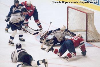 Une fois encore, les Nordiques ont dominé des crosses et des patins leur adversaire. Toujours incroyablement maladroits, ils doivent leur salut à deux exploits individuels de leur star de NHL, Espen Knutsen. Sans lui, on ne voit pas comment ils auraient enfilé quelque chose cet après-midi. Le petit Norvégien a d'abord transformé un penalty - très généreux - de brillante manière, quasiment au terme d'un premier tiers étonnamment infructueux au vu des franches chances norvégiennes (1-0 à 18'47). Puis, pendant la dernière période, Knutsen a su trouver de nouveau le chemin des filets en jeu de puissance d'un tir du poignet fulgurant (2-0 à 43'13), libérant enfin son équipe sous la menace perpétuelle d'un contre assassin de Makrov ou Suursoo. Désormais soulagée, la Norvège s'en allait marquer un troisième et dernier but par l'intermédiaire de Trond Magnussen (3-0 à 48'26).