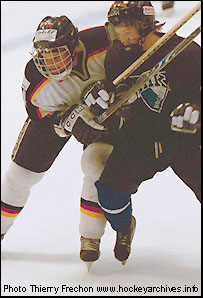 Le souffre et le miel sur la glace, c'était ce qui nous attendait dans cette deuxième période. L'armée des fières amazones de Bavière est composée de sept internationales ayant disputées les derniers championnats du Monde Elite avec la "Mannschaft" où elles se sont classées sixième derrière, entre autres, la Finlande (troisième), où figurait trois joueuses du IHK Helsinki, mais une seule (a priori puisque quelques noms nous manquent dans la compo) a fait le déplacement à Cergy. Mi-anges mi-démons, les chevalières en chandail allaient nous donner du sport romantique et échevelé. Les Allemandes essayaient de trouver la faille, usant l'organisation bien regroupée des Finlandaises sans toutefois se livrer complètement. En effet, les joueuses d'outre-Rhin, fortes de trois lignes complètes, étaient patientes, donnant l'impression d'effectuer un travail de sape qui paierait tôt ou tard. Il paya sur un relâchement adverse. En supériorité, les joueuses d'Helsinki étaient inattentives et elles laissaient un contre allemand partir à l'abordage des filets de Senna Nokkosmäki. Michaela Lanzl prenait le rebond laissé par la gardienne d'Helsinki pour égaliser (2-2 à 28'55). Ce but en infériorité donna un coup au moral des Finlandaises. Maritta Becker, à la fois cerveau, figure de proue et capitaine du vaisseau allemand qui voguait alors sur les eaux de la confiance, en profitait pour inscrire le but gagnant d'un exploit personnel. Elle bénéficiait d'un marquage trop large et fit un tour de cage caniculaire, qui prenait de vitesse la gardienne ne pouvant recoller au poteau opposé avant que la rondelle ne flirte dans ses filets (2-3 à 29'33). Plus tard, l'arbitre M. Bergamelli, asphyxié par toutes ces véloces filles à surveiller, sifflait abusivement un retard de jeu aux Finlandaises pourtant exactes au rendez-vous de la mise au jeu. Cette supériorité spoliait Helsinki car elle profitait à l'équipe de Bavière en général et à Anya Scheytt en particulier, servie d'une maître passe de l'incontournable Maritta Becker (2-4 à 39'30).