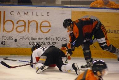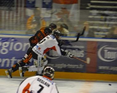 Le match n'est pas brillant mais plutôt rugueux. Fouquerel, parfois un peu en difficulté, tient toujours, stoppant de la mitaine un lancer de Clarke en entrée de zone. Les mises en échec pleuvent de plus en plus, Ennaffati en fait les frais et prend deux minutes. La défense tourangelle, bien placée, résiste sans souffrir. Une partie un peu de "pousse-palet" ce soir, les deux équipes peinant à enchainer deux passes de suite... En attendant, le public se console avec un sacré duel de mises en échec ! Pour sortir de la torpeur, rien de mieux qu'un tir de pénalité ! Drzik se jette pour empêcher Geslain de filer au but et l'arbitre accorde la sanction logique. Poudrier ne transforme pas la bonne chance, stoppé par Russo. De l'autre côté, c'est Olivier Filion qui file au but, se heurtant au superbe lancer de botte de Fouquerel. Deux actions qui sont bien les seules intéressantes de cette période insipide... Une ultime action de Saul et Noël, qui tente un tour de cage après un premier arrêt du gardien, suivie d'un tir de la bleue dévié. Cela s'est un peu accéléré en fin de tiers, mais globalement, ce n'est pas un grand spectacle.