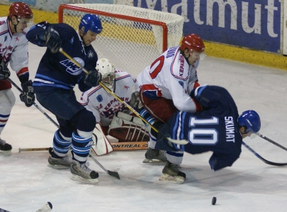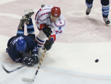 Le rythme tombe un peu jusqu'à 34'02", quand Yuri Faïkov (joueur de quatrième ligne du Keramin qui a conduit les... Émirats Arabes Unis à la première Coupe Arabe !) est pénalisé pour accrocher. La pression est forte et Sushko - photo de gauche - commet une obstruction dans l'enclave. Martin est à 5 contre 3 pour dix-huit secondes, et c'est suffisant. Même le traitement musclé de Pavel Chernook - photo de droite - n'empêche pas le Tchèque Lukas Havel de faire fructifier le palet dans le slot (2-1, 35'56"). Minsk est à la peine et Blagoï fait nettement trébucher Cech avant la ligne bleue. La pénalité est tuée, mais juste avant la pause, les bleus portent le coup de grâce sur leur dernière attaque : le Letton Guntis Dzerins arrive à la cage par la droite, le gardien Karpikov s'interpose d'un lancer de jambières et laisse le rebond dans l'axe à Ivan Dornic devant des filets entièrement déserts (3-1, 39'37").