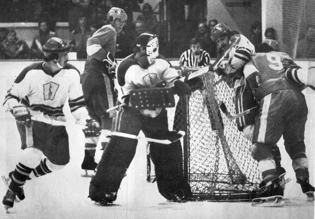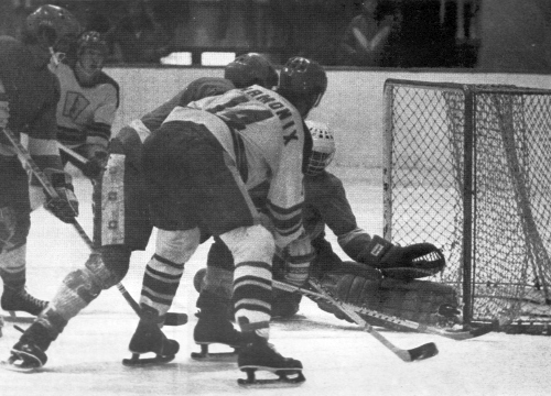 ... à Saint-Gervais pour la rencontre au sommet qui oppose les deux premiers du championnat. Une heure avant le match, la patinoire est comble. À l'entrée, on nous dit 1850 entrées payantes, plus les abonnés ; plus les invitations, plus les officiels, en tout, sans doute plus de 2000 personnes. On n'ose pas nous dire le nombre (à cause des règlements de sécurité). Partout des spectateurs, assis, debout dans le bar, contre les bandes, derrière les filets de protection.